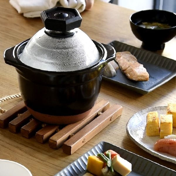 This rice cooker can cook one cup (about 150g) of rice. The heatproof glass lid allows you to see your rice as it cooks and the body is Japanese-made Banko ware. When the rice is cooked, the whistle on the handle of the lid will let you know. Comes with four recipes for using seasonal ingredients.