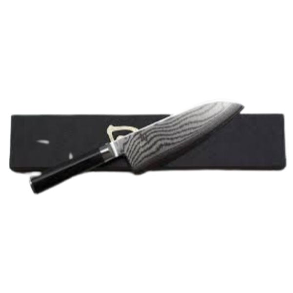 The Kai DM-0717 Shun Damascus santoku Knife has a 190 mm blade with a 122mm handle, and is very handy for chopping and slicing vegetables. Knives have a D shaped handle which has been ergonomically designed to fit comfortably in your hand. The handles are made from fine laminated Pakka wood and has a full tang construction.