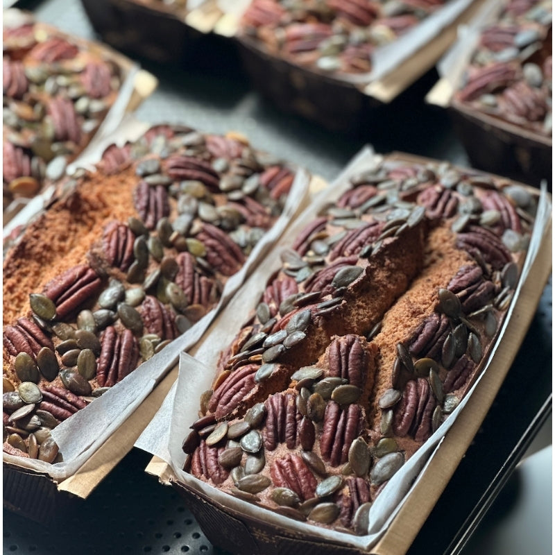 成分: 杏仁粉、雞蛋、羅漢果甜味劑、椰奶、椰子油*、發芽山核桃、發芽南瓜籽、南瓜香料*、檸檬汁、小蘇打(*有機)
