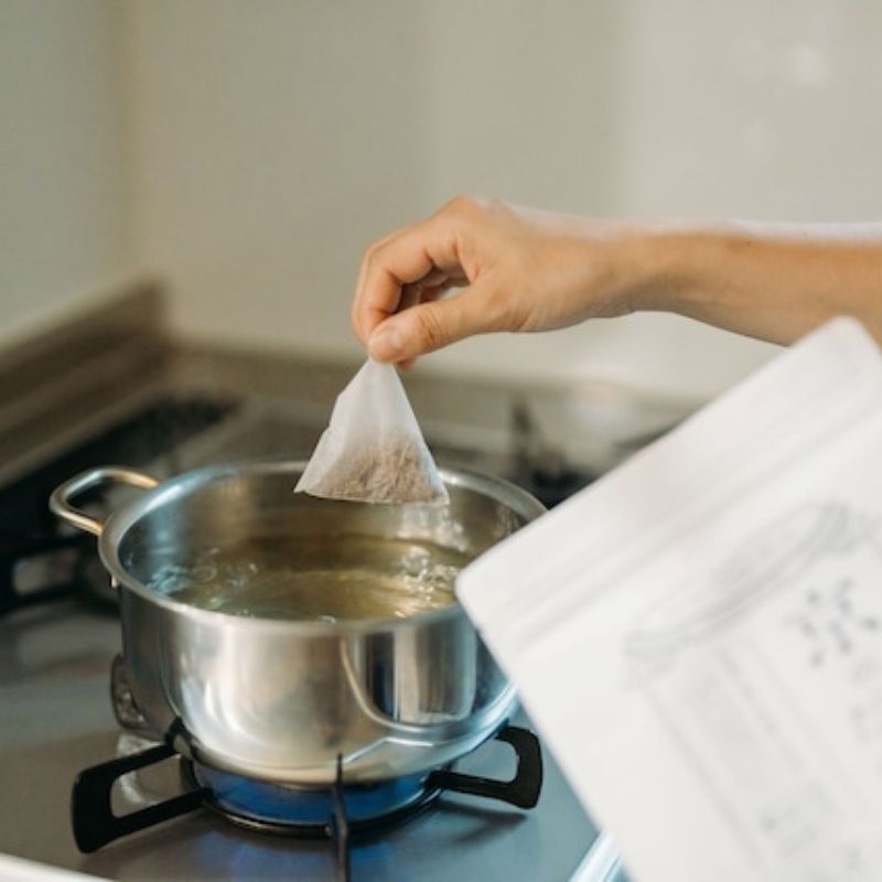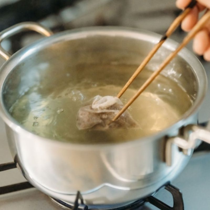 The shape of the non-woven fabric is tetrahedral. The convection generated inside the pot evenly distributes heat to the shavings within the non-woven fabric, allowing for quick extraction of the dashi.