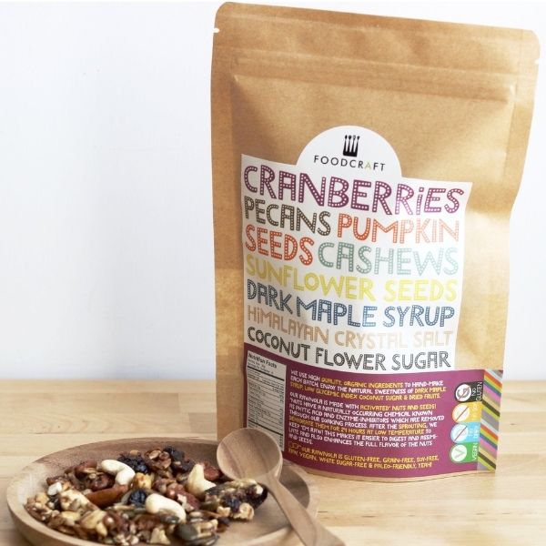 一種不含堅果原始飲食營養的生榖麥片混合物,不含穀物。我們的生格蘭諾拉麥片由活性種子和乾果製成。帶殼的種子(如葵花籽)含有一種天然存在的化學物質,稱為植酸和酶抑製劑,它們通過我們的浸泡過程去除。發芽後,我們將種子在低溫下脫水 24 小時。這使它們更容易被消化和吸收,也增強了種子的完整風味。